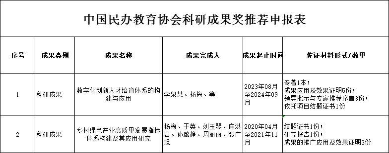 2025年11月11日,我校召开了《中国民办教育协会科研成果奖》评审论证会,经专家评审,研究决定拟推荐2项申报,现予以公示: